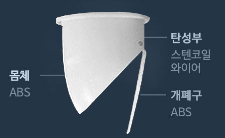 스테인리스 스틸의 강한 탄력성, 실리콘의 완벽한 밀폐성을 이용한 자동개폐방식의 완벽한 하수구 냄새차단 배수트랩입니다.