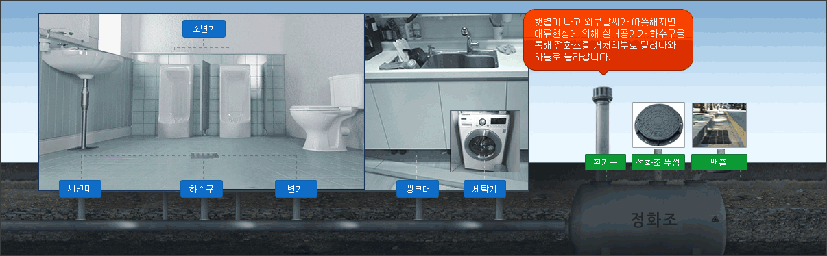 악취의 원인"냄새가 발생하는 이유" 대류현상에 의해 악취가 배수구를 통해 올라오게 되며, 기타 우수관을 통해서도 발생할수 있습니다.상위로